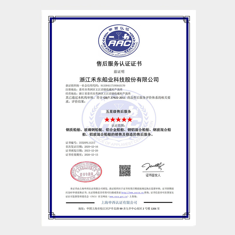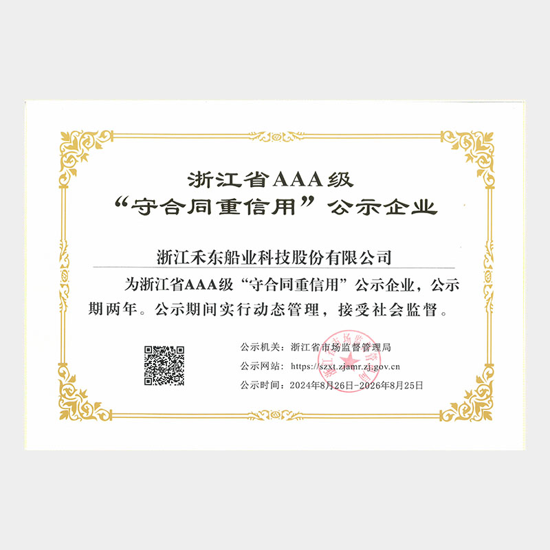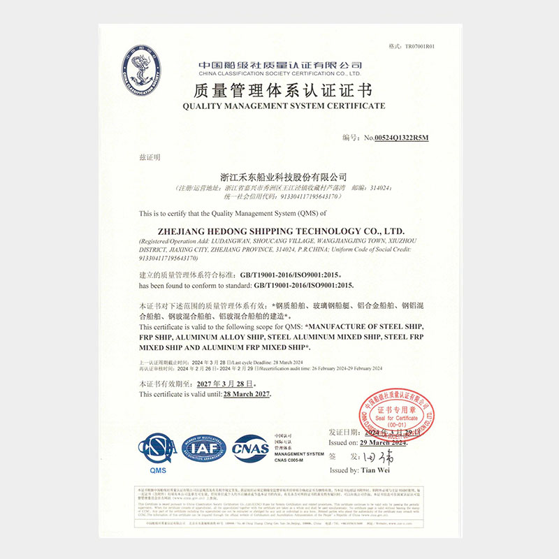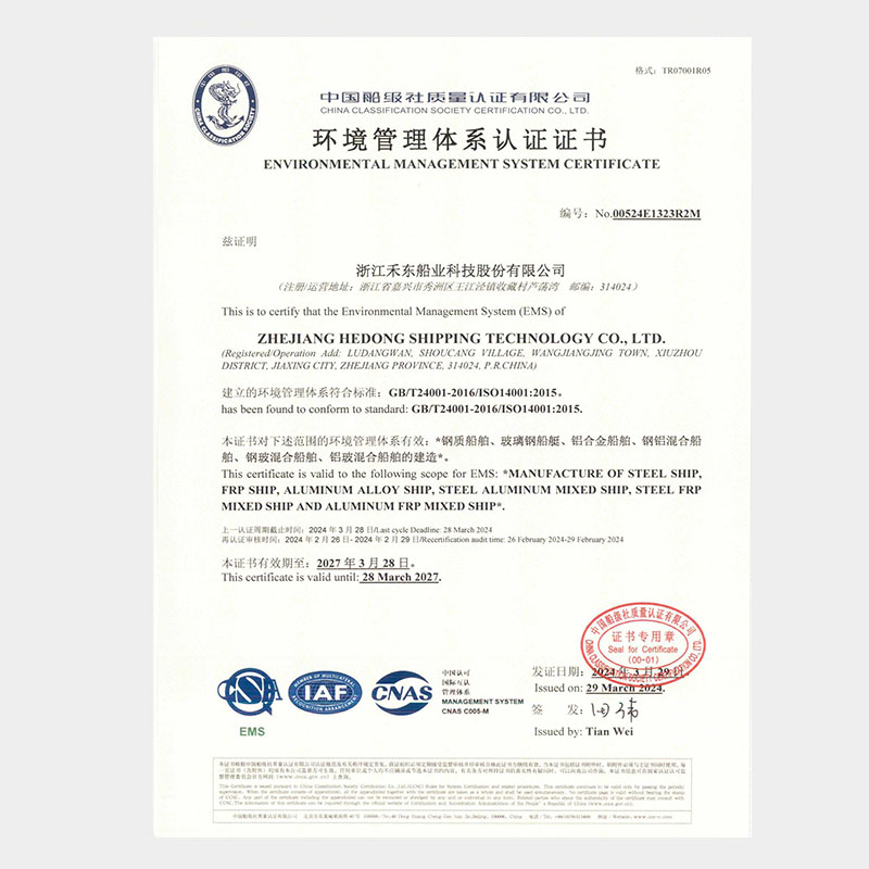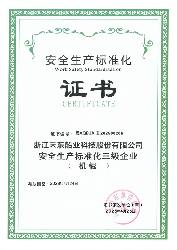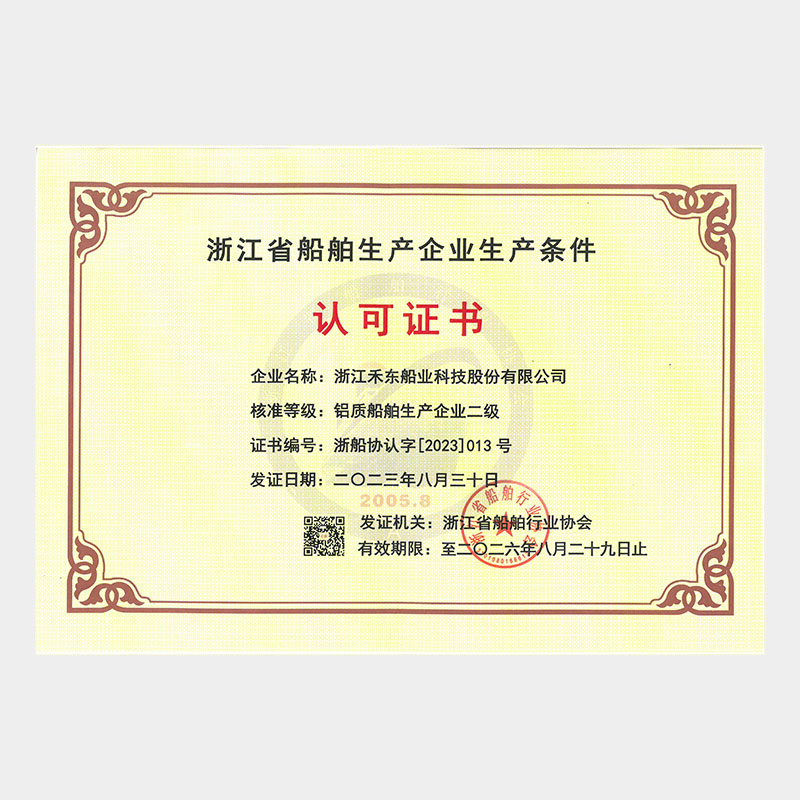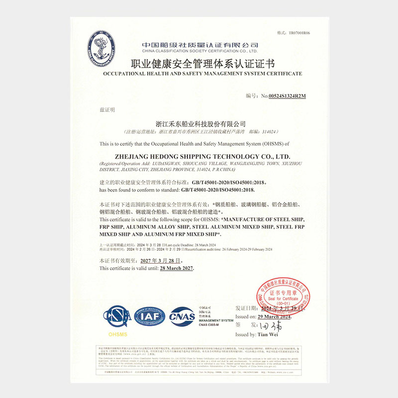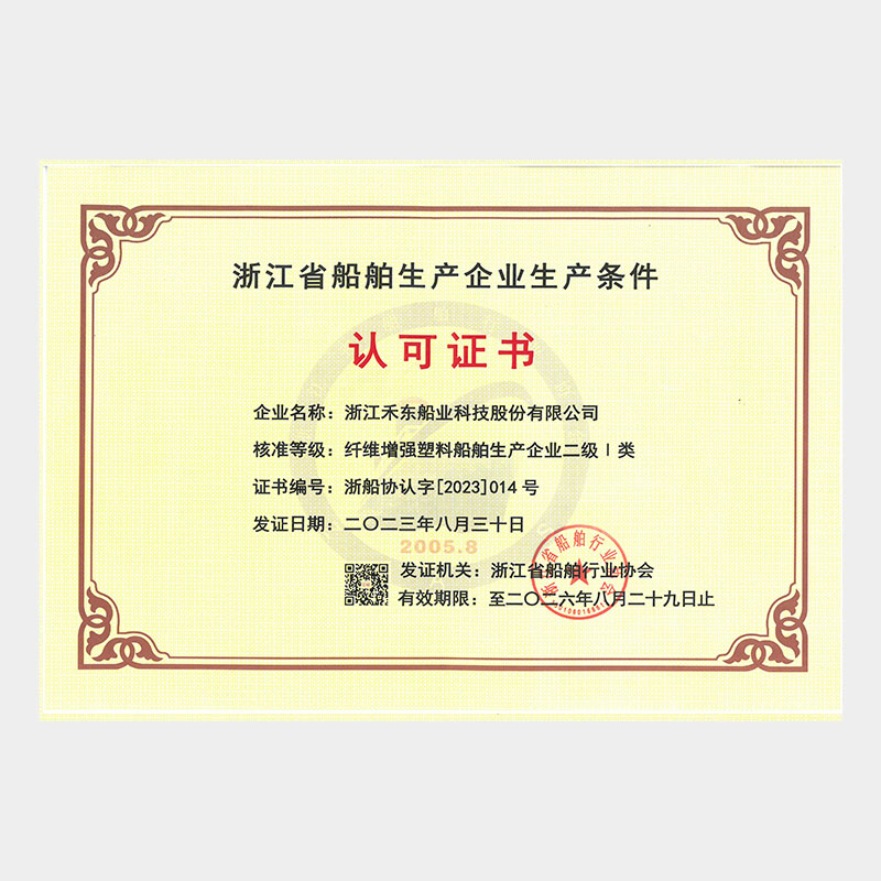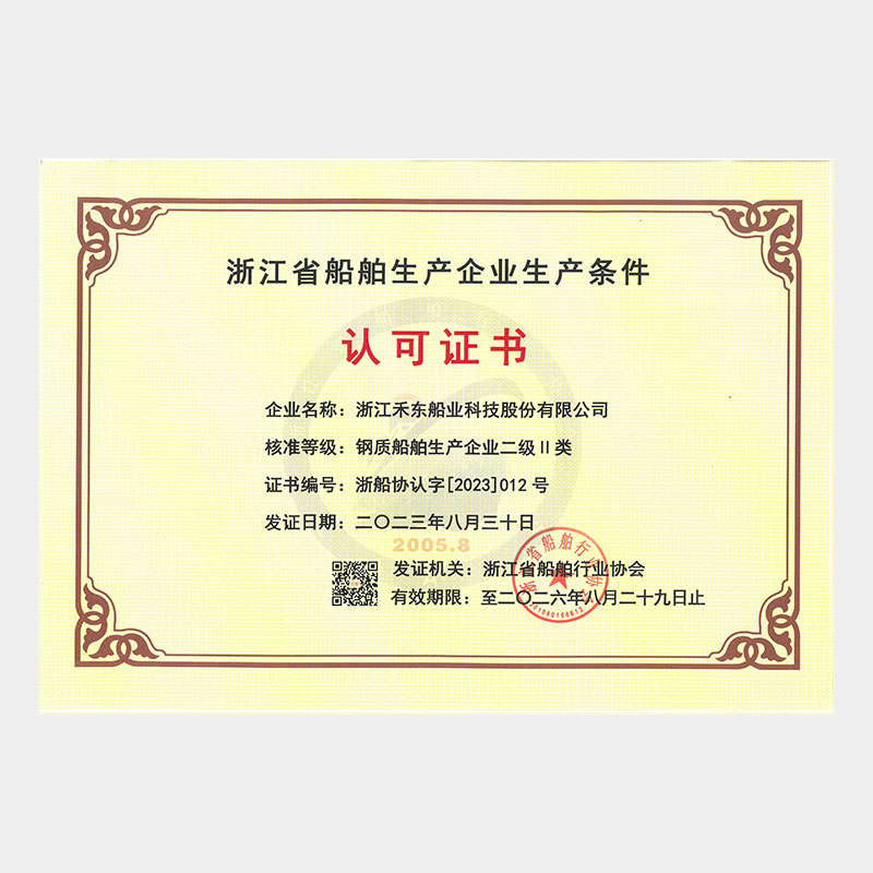 公司具備鋼質(zhì)船舶制造企業(yè)二級∥類、鋁質(zhì)船舶制造企業(yè)三級和纖維增強塑料船舶制造企業(yè)二級類資質(zhì),擁有中國船級社認證公司認證的IS09001質(zhì)量管理體系、ISO14001 環(huán)境管理體系認證證書和OHSAS18001職業(yè)健康安全管理體系和按照國家相關(guān)標準建立的安全生產(chǎn)標準化三級體系。